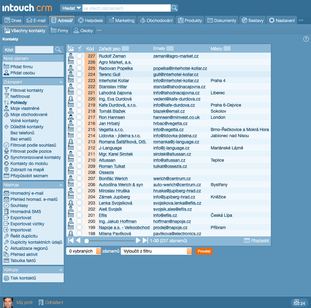 Na obrázku vidíte typický pohled do uživatelského rozhraní InTouch CRM. Níže blíže rozebereme jednotlivé části rozhraní.